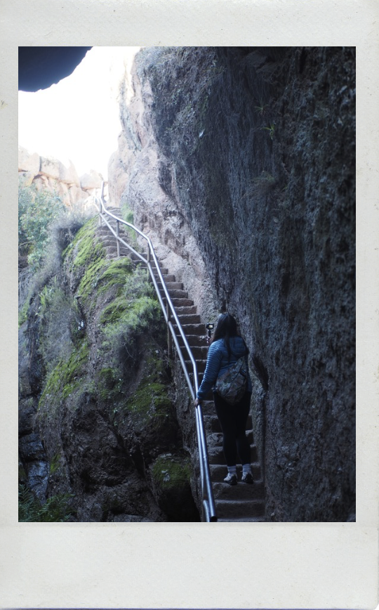 Walking through the cave was thrilling! The caves at Pinnacles NP are Talus Caves! They are formed when large boulders or rock fragments tumble down from cliffs and get wedged in between narrow canyons or fractures.1 Within the cave was very dark with the sound of water gushing through. There were stairs, imaged below, to make our way upward through the cave.